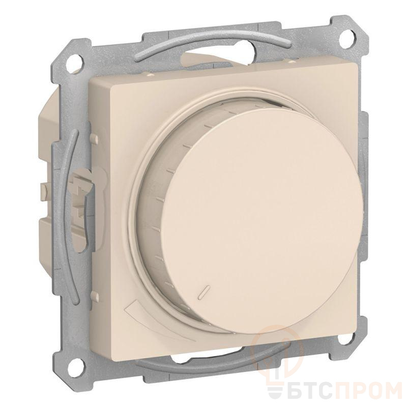Механизм светорегулятора Systeme Electric (ранее Schneider Electric) серии AtlasDesign (цвет бежевый) поворотно-нажимной для нагрузки мощностью до 400 Вт, подходит для LED ламп. - Светорегулятор позволяет установить в помещении комфортный уровень освещения. - При подключении второго переключателя диммер может использоваться как проходной переключатель. - Может использоваться как выключатель или переключатель. - Выполнен из материала, стойкого к УФ-излучению и появлению царапин.