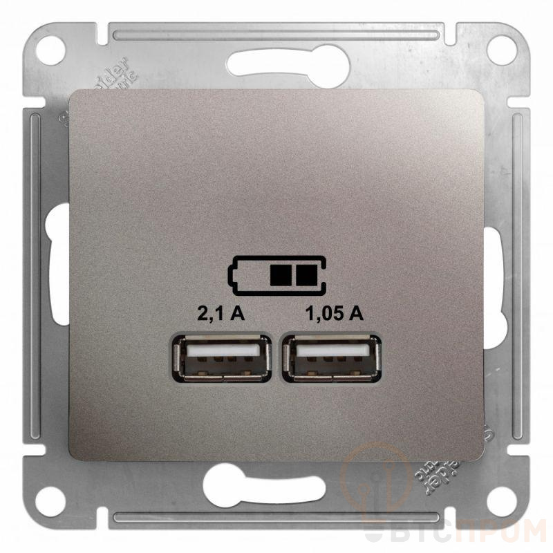 Механизм Systeme Electric (ранее Schneider Electric) серии Glossa (цвет платина) розетки с двумя разъёмами USB с выходными напряжением 5 В постоянного тока и выходами с номинальным током по 2,1 А. - Предназначен для зарядки мобильных устройств: телефоны, планшетные компьютеры, mp3/mp4 плееры. - Может заряжать одно или два устройства одновременно. - Выполнен из материала PС+ASA, стойкого к УФ-излучению и появлению царапин.