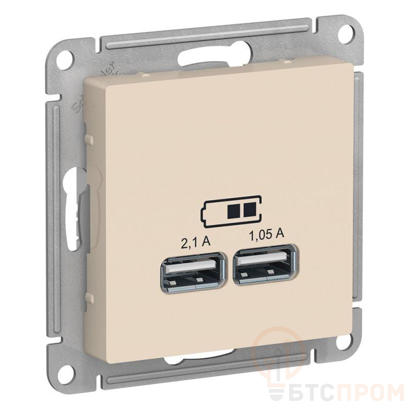 Механизм Systeme Electric (ранее Schneider Electric) серии AtlasDesign в цвете бежевый розетки для зарядки с двумя разъёмами USB с выходными напряжением 5 В постоянного тока и выходами с номинальным током по 2,1 А. - USB розетка позволяет напрямую заряжать одно или два мобильных устройства. - Лицевые детали из качественного ABS-пластика, устойчивого к царапинам и УФ-излучению. - Усиленные прямые монтажные лапки для лучшей фиксации механизма в монтажной коробке.