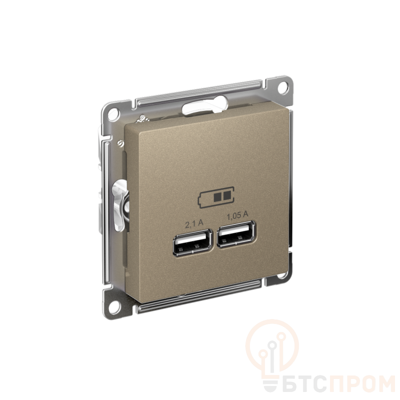 Механизм Systeme Electric (ранее Schneider Electric) серии AtlasDesign в цвете шампань розетки для зарядки с двумя разъёмами USB с выходными напряжением 5 В постоянного тока и выходами с номинальным током по 2,1 А. - USB розетка позволяет напрямую заряжать одно или два мобильных устройства. - Лицевые детали из качественного ABS-пластика, устойчивого к царапинам и УФ-излучению. - Усиленные прямые монтажные лапки для лучшей фиксации механизма в монтажной коробке.