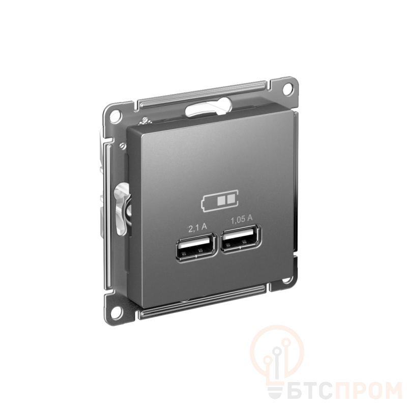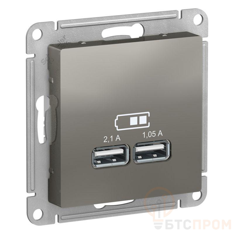 Механизм Systeme Electric (ранее Schneider Electric) серии AtlasDesign в цвете сталь розетки для зарядки с двумя разъёмами USB с выходными напряжением 5 В постоянного тока и выходами с номинальным током по 2,1 А. - USB розетка позволяет напрямую заряжать одно или два мобильных устройства. - Лицевые детали из качественного ABS-пластика, устойчивого к царапинам и УФ-излучению. - Усиленные прямые монтажные лапки для лучшей фиксации механизма в монтажной коробке.