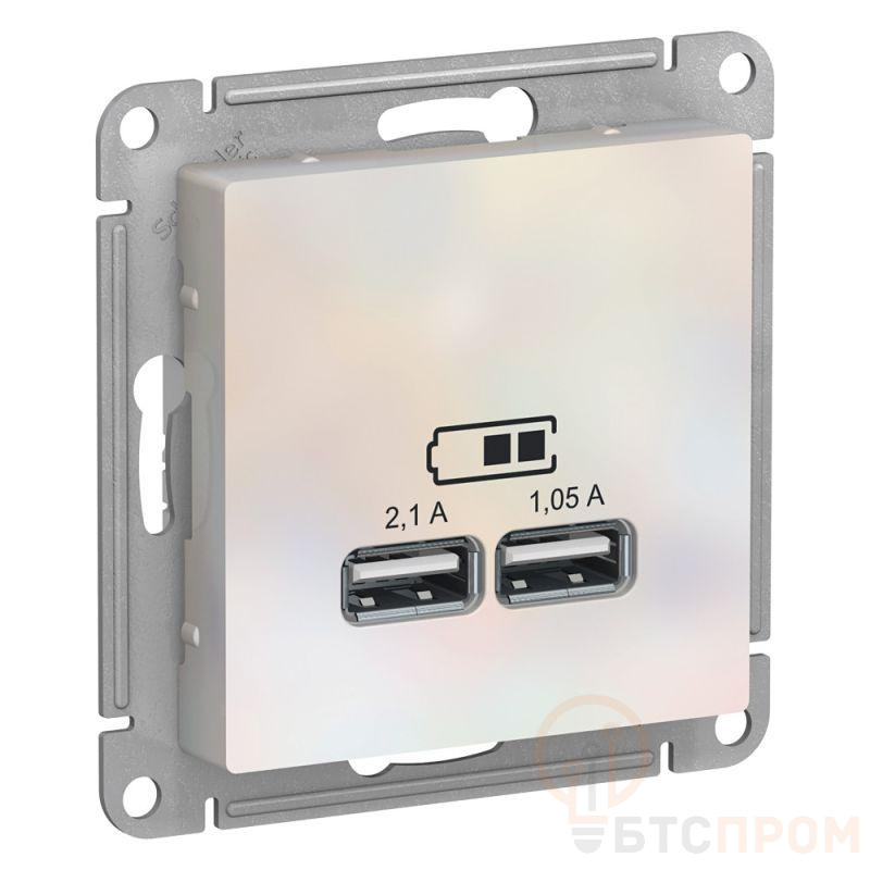 Механизм Systeme Electric (ранее Schneider Electric) серии AtlasDesign в цвете жемчуг розетки для зарядки с двумя разъёмами USB с выходными напряжением 5 В постоянного тока и выходами с номинальным током по 2,1 А. - USB розетка позволяет напрямую заряжать одно или два мобильных устройства. - Лицевые детали из качественного ABS-пластика, устойчивого к царапинам и УФ-излучению. - Усиленные прямые монтажные лапки для лучшей фиксации механизма в монтажной коробке.
