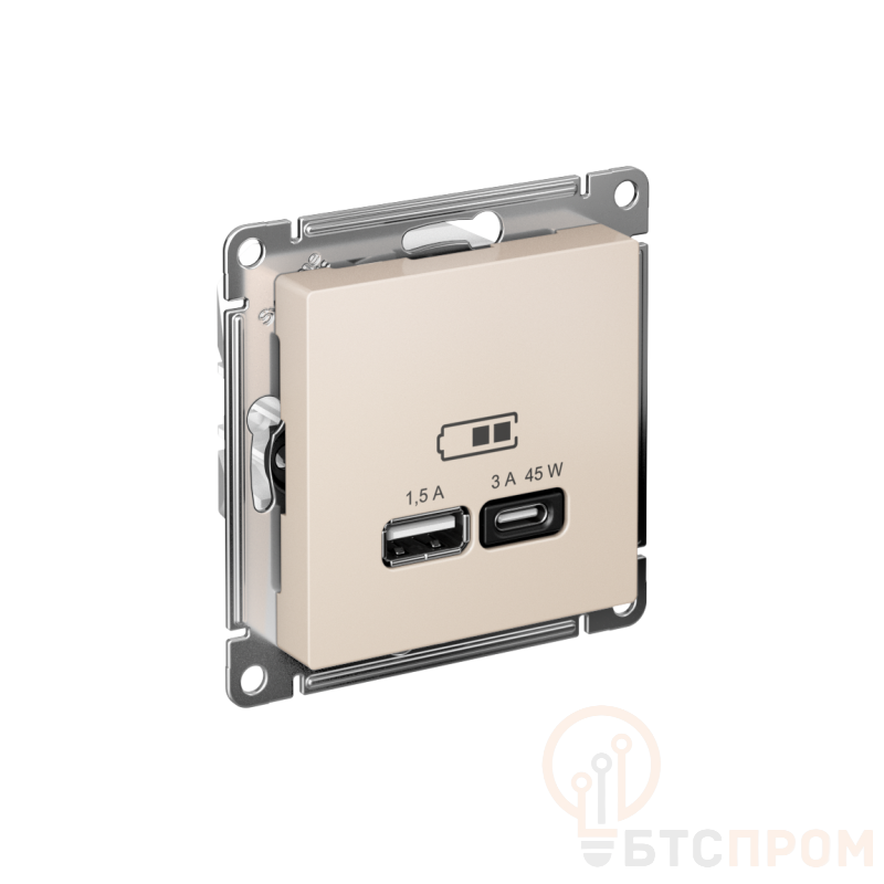 Розетка Systeme Electric (ранее Schneider Electric) серии AtlasDesign в цвете бежевый двойная USB с разъемами типа A+C высокоскоростная. Самая современная USB-зарядка с двумя разъемами позволяет заряжать как стандартные мобильные устройства через разъем типа А, так и новейшие устройства с разъемом типа С. Позволяет заряжать смартфоны последнего поколения, которые поддерживают функцию быстрой зарядки. Мощность: тип-A – 7.5 Вт, тип-С - 45Вт. Поддерживает современные протоколы быстрой зарядки QC, PD, последних версий. Лицевые детали из качественного ABS-пластика, устойчивого к царапинам и УФ-излучению.