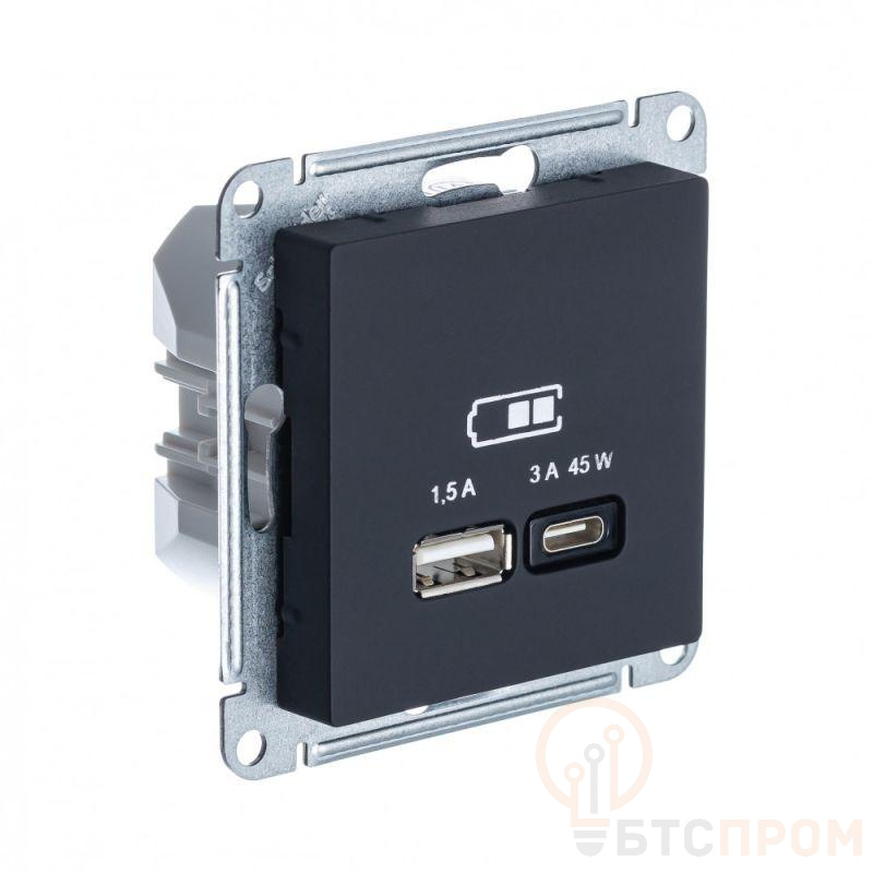 Розетка Systeme Electric (ранее Schneider Electric) серии AtlasDesign (цвет карбон) двойная USB с разъемами типа A+C высокоскоростная. - Самая современная USB-зарядка с двумя разъемами позволяет заряжать как стандартные мобильные устройства через разъем типа А, так и новейшие устройства с разъемом типа С. - Позволяет заряжать смартфоны последнего поколения, которые поддерживают функцию быстрой зарядки. - Мощность: тип-A – 7.5 Вт, тип-С - 45Вт. - Поддерживает современные протоколы быстрой зарядки QC, PD, последних версий. - Лицевые детали из качественного ABS-пластика, устойчивого к царапинам и УФ-излучению.