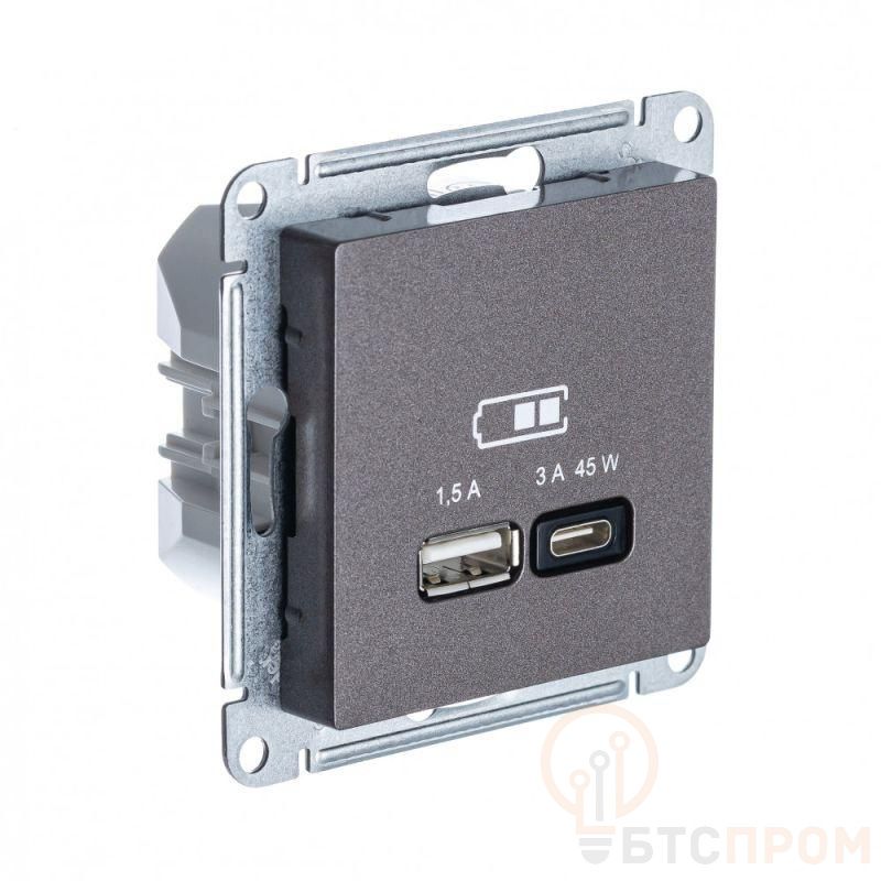 Розетка Systeme Electric (ранее Schneider Electric) серии AtlasDesign (цвет мокко) двойная USB с разъемами типа A+C высокоскоростная. - Самая современная USB-зарядка с двумя разъемами позволяет заряжать как стандартные мобильные устройства через разъем типа А, так и новейшие устройства с разъемом типа С. - Позволяет заряжать смартфоны последнего поколения, которые поддерживают функцию быстрой зарядки. - Мощность: тип-A – 7.5 Вт, тип-С - 45Вт. - Поддерживает современные протоколы быстрой зарядки QC, PD, последних версий. - Лицевые детали из качественного ABS-пластика, устойчивого к царапинам и УФ-излучению.