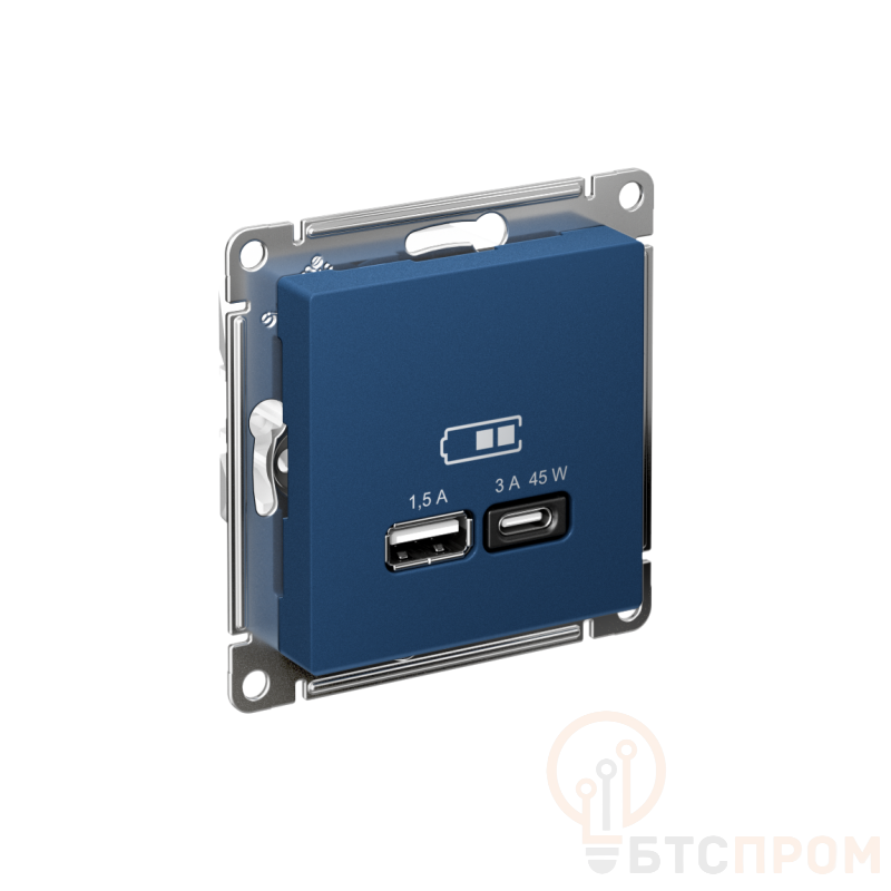 Розетка Systeme Electric (ранее Schneider Electric) серии AtlasDesign (цвет аквамарин) двойная USB с разъемами типа A+C высокоскоростная. Самая современная USB-зарядка с двумя разъемами позволяет заряжать как стандартные мобильные устройства через разъем типа А, так и новейшие устройства с разъемом типа С. Позволяет заряжать смартфоны последнего поколения, которые поддерживают функцию быстрой зарядки. Мощность: тип-A – 7.5 Вт, тип-С - 45Вт. Поддерживает современные протоколы быстрой зарядки QC, PD, последних версий. Лицевые детали из качественного ABS-пластика, устойчивого к царапинам и УФ-излучению.