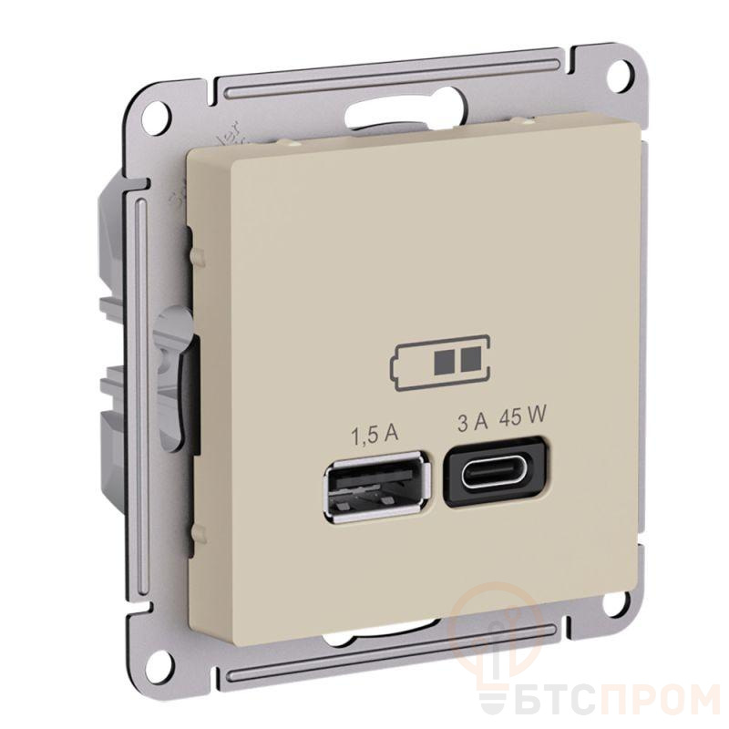 Розетка Systeme Electric (ранее Schneider Electric) серии AtlasDesign (цвет песочный) двойная USB с разъемами типа A+C высокоскоростная. Самая современная USB-зарядка с двумя разъемами позволяет заряжать как стандартные мобильные устройства через разъем типа А, так и новейшие устройства с разъемом типа С. Позволяет заряжать смартфоны последнего поколения, которые поддерживают функцию быстрой зарядки. Мощность: тип-A – 7.5 Вт, тип-С - 45Вт. Поддерживает современные протоколы быстрой зарядки QC, PD, последних версий. Лицевые детали из качественного ABS-пластика, устойчивого к царапинам и УФ-излучению.