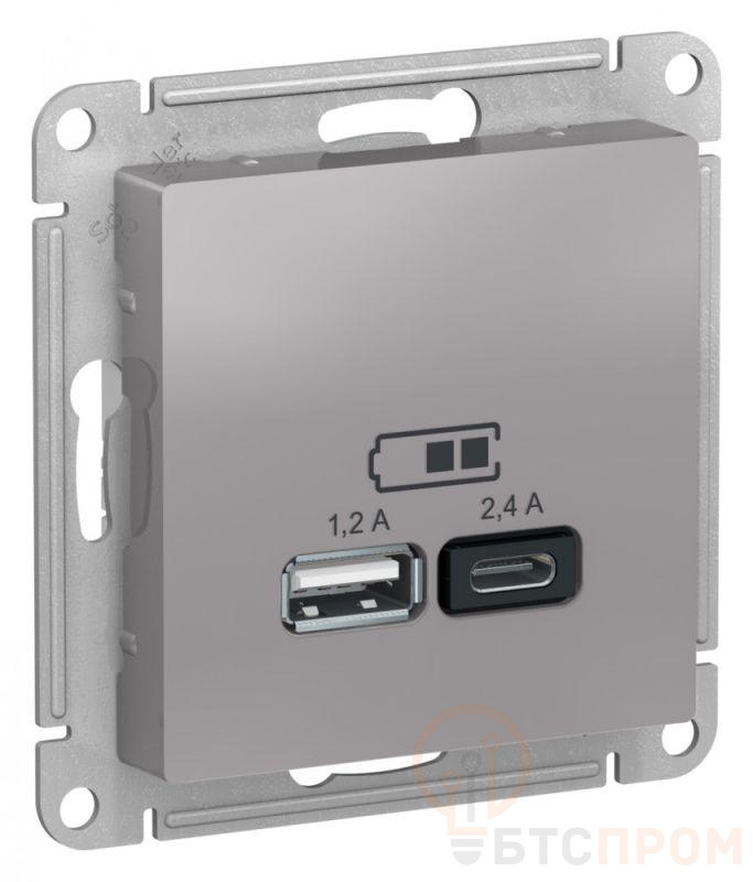 Розетка Systeme Electric (ранее Schneider Electric) серии AtlasDesign в цвете алюминий двойная USB с разъемами типа A+C - Лицевые детали из качественного ABS-пластика, устойчивого к царапинам и УФ-излучению. - Самая современная USB-зарядка с двумя разъемами позволяет заряжать как стандартные мобильные устройства через разъем типа А, так и новейшие устройства, в том числе ноутбуки, с разъемом типа С.