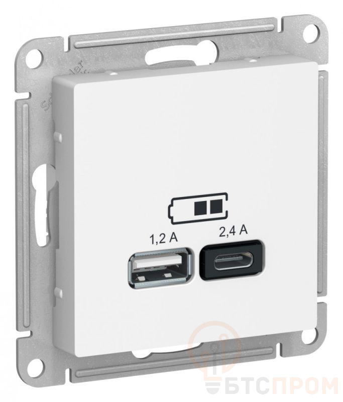 Розетка Systeme Electric (ранее Schneider Electric) серии AtlasDesign в цвете ЛОТОС двойная USB с разъемами типа A+C - Лицевые детали из качественного ABS-пластика, устойчивого к царапинам и УФ-излучению. - Самая современная USB-зарядка с двумя разъемами позволяет заряжать как стандартные мобильные устройства через разъем типа А, так и новейшии устройства, в том числе ноутбуки, с разъемом типа С.