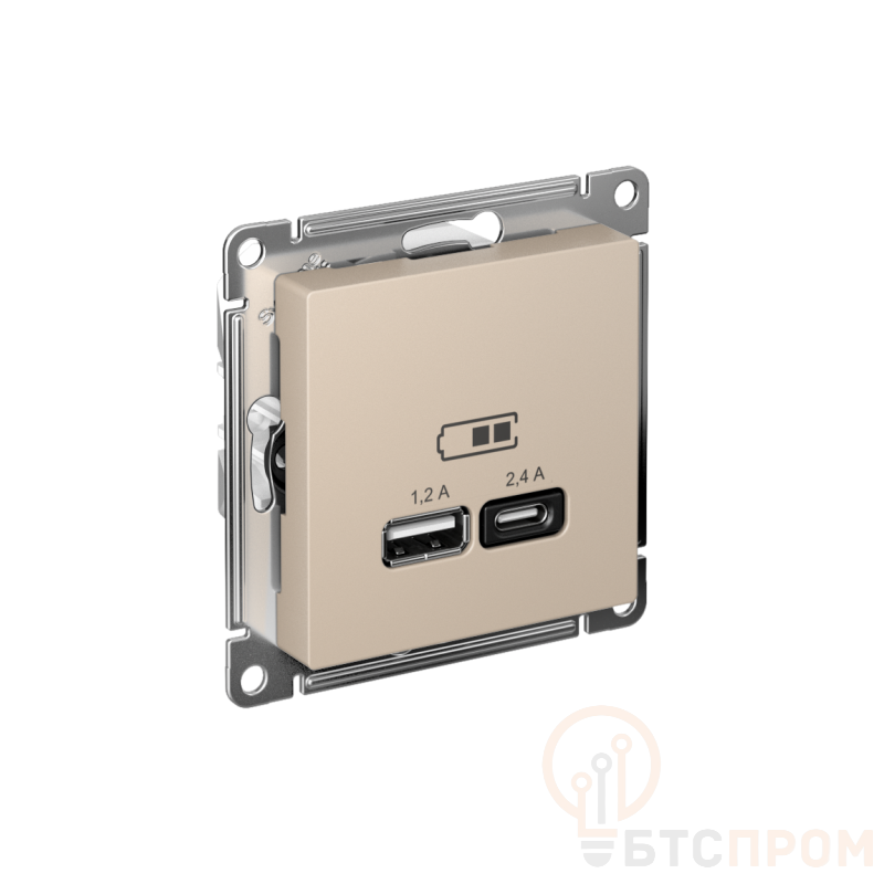 Розетка Systeme Electric (ранее Schneider Electric) серии AtlasDesign в цвете песочный двойная USB с разъемами типа A+C. Cовременная USB-зарядка с двумя разъемами позволяет заряжать как стандартные мобильные устройства через разъем типа А, так и новейшие устройства, в том числе ноутбуки, с разъемом типа С.
