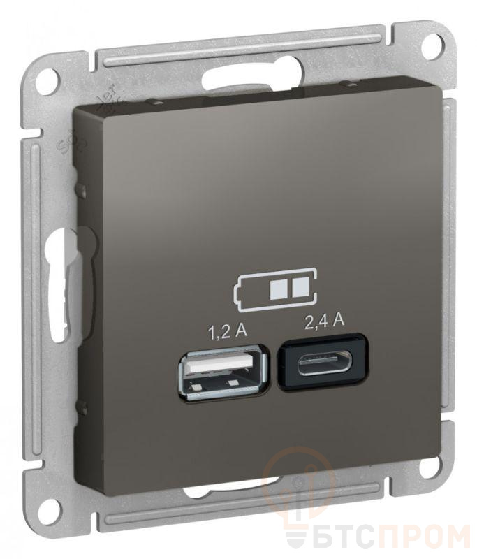 Розетка Systeme Electric (ранее Schneider Electric) серии AtlasDesign в цвете сталь двойная USB с разъемами типа A+C - Лицевые детали из качественного ABS-пластика, устойчивого к царапинам и УФ-излучению. - Самая современная USB-зарядка с двумя разъемами позволяет заряжать как стандартные мобильные устройства через разъем типа А, так и новейшие устройства, в том числе ноутбуки, с разъемом типа С.