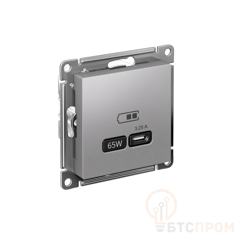 Розетка Systeme Electric (ранее Schneider Electric) серии AtlasDesign (цвет алюминий) USB с разъемом типа C высокоскоростная. - Самая современная USB-зарядка позволяет заряжать ноутбук, а также смартфоны последнего поколения, которые поддерживают функцию быстрой зарядки. - Мощность: тип-С - 65Вт. - Поддерживает современные протоколы быстрой зарядки QC, PD, последних версий. - Лицевые детали из качественного ABS-пластика, устойчивого к царапинам и УФ-излучению.