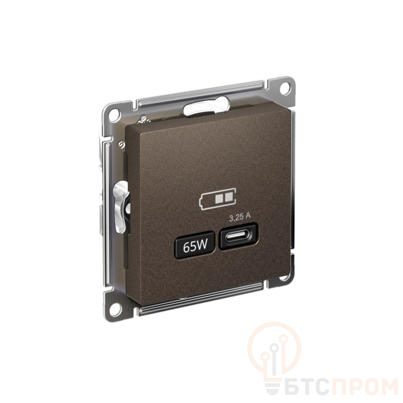 Розетка Systeme Electric (ранее Schneider Electric) серии AtlasDesign в цвете мокко USB с разъемом типа C высокоскоростная. Самая современная USB-зарядка позволяет заряжать ноутбук, а также смартфоны последнего поколения, которые поддерживают функцию быстрой зарядки. Мощность: тип-С - 65Вт. Поддерживает современные протоколы быстрой зарядки QC, PD, последних версий. Лицевые детали из качественного ABS-пластика, устойчивого к царапинам и УФ-излучению.