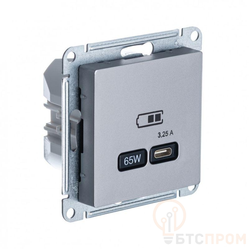 Розетка Systeme Electric (ранее Schneider Electric) серии AtlasDesign (цвет сталь) USB с разъемом типа C высокоскоростная. - Самая современная USB-зарядка позволяет заряжать ноутбук, а также смартфоны последнего поколения, которые поддерживают функцию быстрой зарядки. - Мощность: тип-С - 65Вт. - Поддерживает современные протоколы быстрой зарядки QC, PD, последних версий. - Лицевые детали из качественного ABS-пластика, устойчивого к царапинам и УФ-излучению.