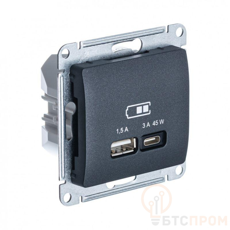 Розетка Systeme Electric (ранее Schneider Electric) серии Glossa (цвет антрацит) двойная USB с разъемами типа A+C высокоскоростная. - Самая современная USB-зарядка с двумя разъемами позволяет заряжать как стандартные мобильные устройства через разъем типа А, так и новейшие устройства с разъемом типа С. - Позволяет заряжать смартфоны последнего поколения, которые поддерживают функцию быстрой зарядки. - Мощность: тип-A – 7.5 Вт, тип-С - 45Вт. - Поддерживает современные протоколы быстрой зарядки QC, PD, последних версий. - Лицевые детали из качественного ABS-пластика, устойчивого к царапинам и УФ-излучению.