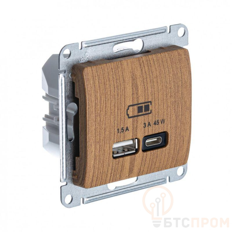 Розетка Systeme Electric (ранее Schneider Electric) серии Glossa (цвет дерево дуб) двойная USB с разъемами типа A+C высокоскоростная. - Самая современная USB-зарядка с двумя разъемами позволяет заряжать как стандартные мобильные устройства через разъем типа А, так и новейшие устройства с разъемом типа С. - Позволяет заряжать смартфоны последнего поколения, которые поддерживают функцию быстрой зарядки. - Мощность: тип-A – 7.5 Вт, тип-С - 45Вт. - Поддерживает современные протоколы быстрой зарядки QC, PD, последних версий. - Лицевые детали из качественного ABS-пластика, устойчивого к царапинам и УФ-излучению.