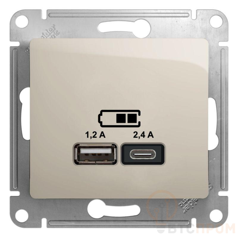 Розетка Systeme Electric (ранее Schneider Electric) серии Glossa (цвет молочный) двойная USB с разъемами типа A+C - Выполнена из материала PС+ASA, стойкого к УФ-излучению и появлению царапин. - Самая современная USB-зарядка с двумя разъемами позволяет заряжать как стандартные мобильные устройства через разъем типа А, так и новейшии устройства, в том числе ноутбуки, с разъемом типа С.