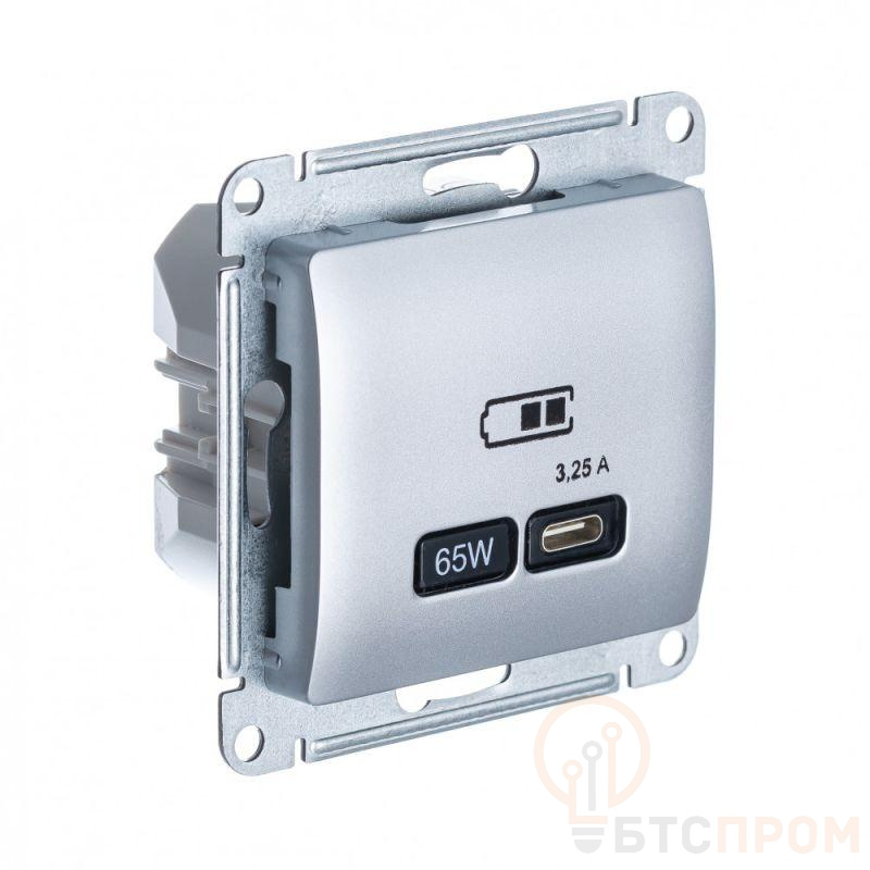Розетка Systeme Electric (ранее Schneider Electric) серии Glossa (цвет алюминий) USB с разъемом типа C высокоскоростная. - Самая современная USB-зарядка позволяет заряжать ноутбук, а также смартфоны последнего поколения, которые поддерживают функцию быстрой зарядки. - Мощность: тип-С - 65Вт. - Поддерживает современные протоколы быстрой зарядки QC, PD, последних версий. - Лицевые детали из качественного ABS-пластика, устойчивого к царапинам и УФ-излучению.