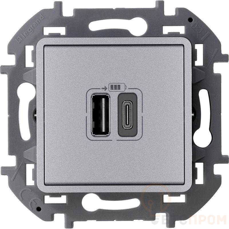 Зарядное устройство Inspiria для скрытого монтажа , тип А-тип С, цвет "Алюминий". Напряжение ~240В/=5В, максимальный зарядный ток 3000 мА. Применяется для непосредственной зарядки одного или двух мобильных устройств.