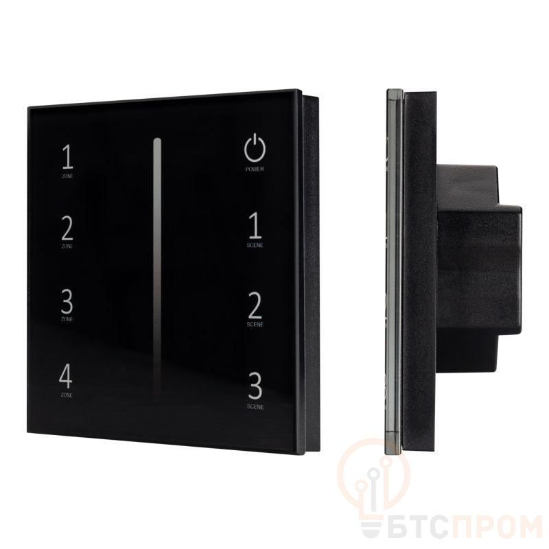 Встраиваемая сенсорная стеклянная панель 2.4 ГГц, цвет чёрный. Для управления яркостью с помощью сенсорной полосы. Питание/рабочее напряжение AC 85-265V, 4 зоны управления, память 4 сцен. Функция управления DMX512 устройствами. Габариты 86х86х36 мм. Панель совместима с диммерами SMART.