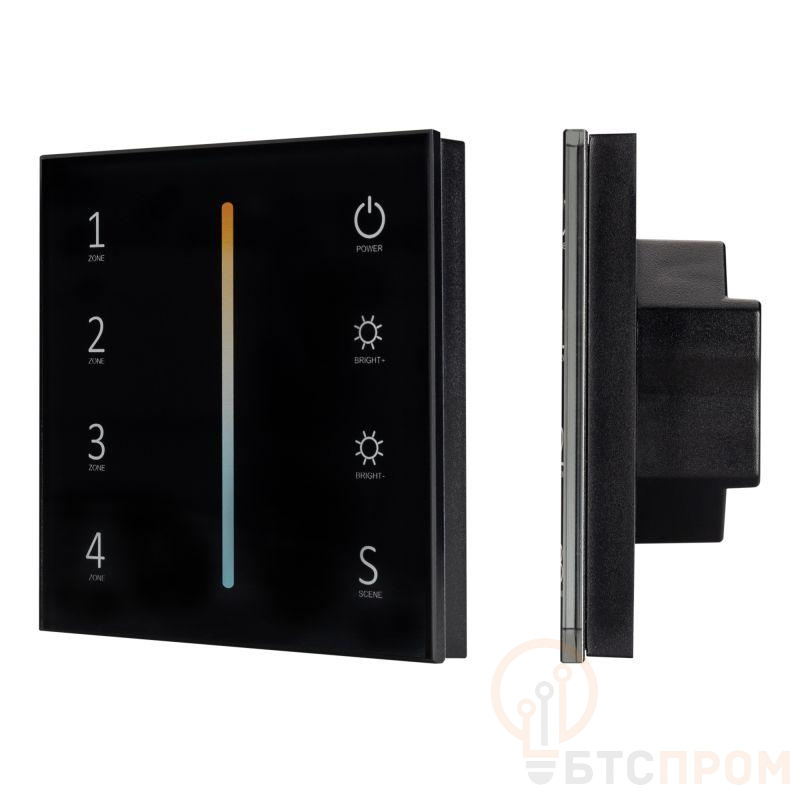 Встраиваемая сенсорная стеклянная панель 2.4 ГГц, цвет чёрный. Для управления температурой свечения (MIX/CCT) и яркостью с помощью сенсорной полосы. Питание/рабочее напряжение AC 100-240V, 4 зоны управления, память 4 сцен. Функция управления DMX512 устройствами. Габариты 86х86х35 мм. Панель совместима с контроллерами и пультами серии SMART.