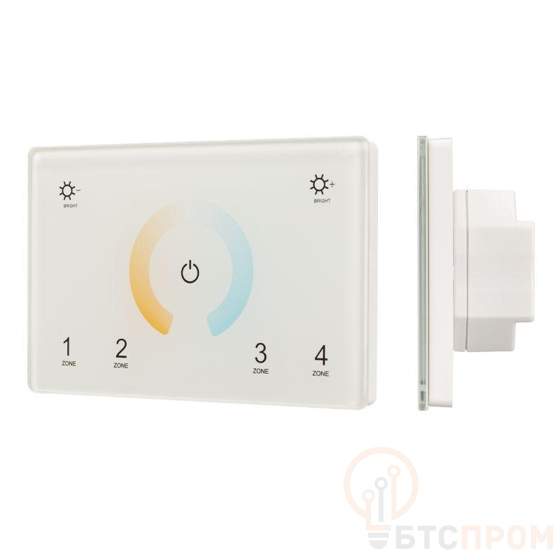 Встраиваемая сенсорная панель 2.4 ГГц, цвет белый. Итальянский стандарт. Материал - стекло. Для управления мультибелыми (MIX/CCT) источниками света (ШИМ), 4 зоны управления. Функция управления DMX512 устройствами. Питание/рабочее напряжение AC 85-265V. Габариты 120х80х37 мм, устанавливается в стандартный подрозетник. Панель совместима с контроллерами серии SMART.