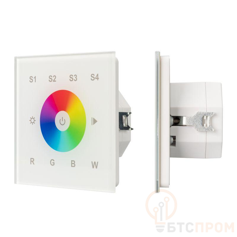 Настенная встраиваемая стеклянная панель белого цвета с сенсорным управлением (сенсорное кольцо и 11 сенсорных кнопок) для мультицветных светодиодных RGBW-лент. 1 зона управления, 4 слота памяти пользовательских настроек. Питание от 230V или от шины DALI. Система команд DT8: до 64 устройств (DALI-DT8), при адресации DT8 4 каналов (RGBW) на 1 адрес.