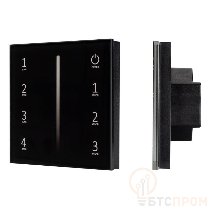Встраиваемая сенсорная панель, цвет чёрный. Материал - стекло. Выходной сигнал 0/1-10V. Управление яркостью с сенсорной полосы. 4 зоны управления. Питание 230V, входное напряжение 86-265VAC. Габариты 86х86х35 мм. Панель совместима с 0/1-10V диммерами.