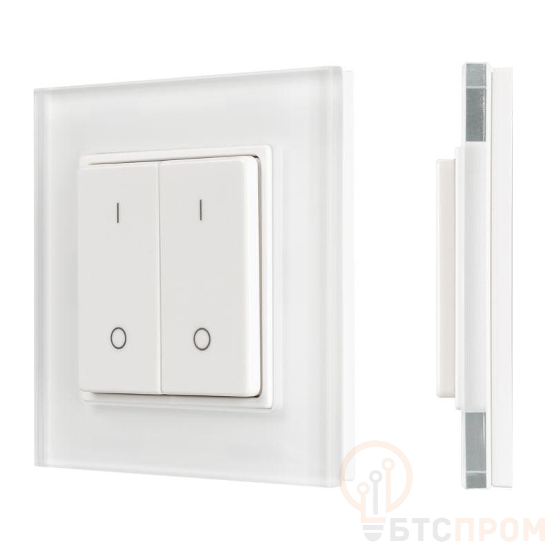 Накладная кнопочная панель 2.4 ГГц, цвет белый. Материал - стекло. Для управления одноцветными источниками света, 2 зоны управления. Питание/рабочее напряжение 3VDC от батарейки CR2032. Габариты 86х86х15 мм. Совместима с диммерами SMART.