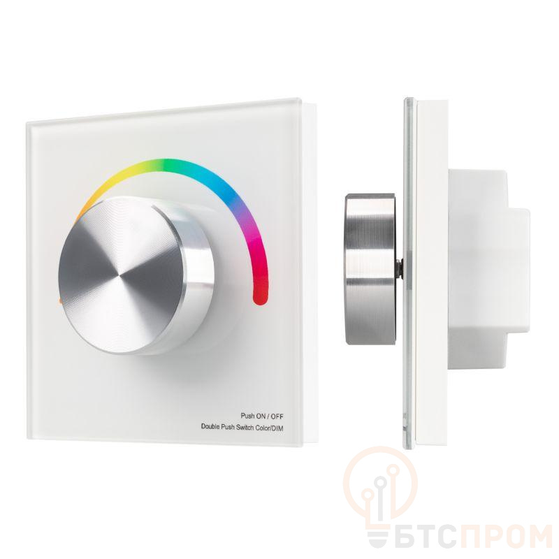 Встраиваемая роторная панель 2.4 ГГц, цвет белый. Материал - стекло/пластик. Для управления RGB источниками света (ШИМ). Управление яркостью с помощью роторного вращателя. Питание/рабочее напряжение 3VDC от батарейки CR2032. Габариты 86х86х50 мм. Предназначена для установки в стандартный подрозетник. Панель совместима с контроллерами серии SMART.