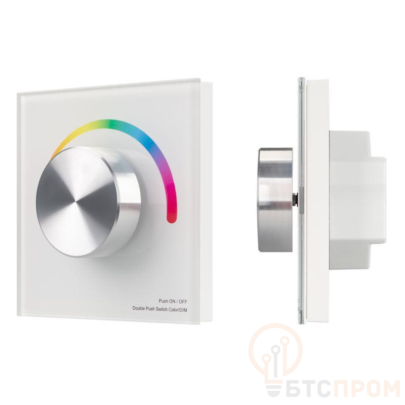 Встраиваемая роторная стеклянная панель 2.4 ГГц, цвет белый. Для управления RGB источниками света (ШИМ). Управление цветом с помощью роторного вращателя. Работает в режиме master/slave и может выполнять функцию независимого контроллера. Питание/рабочее напряжение 12-24VDC, 3 канала по 4А максимальной нагрузки на канал, максимальная суммарная мощность 144-288W. Габариты 86х86х50 мм. Панель совместима с контроллерами и пультами серии SMART.