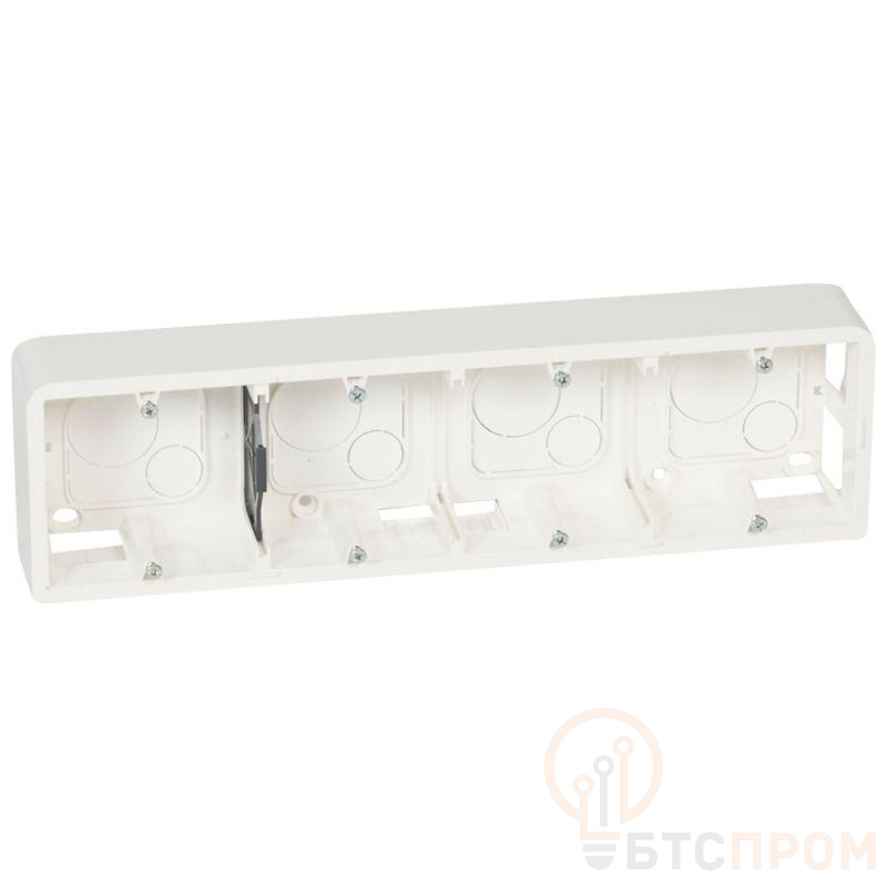Ключевые характеристики: стандарт 4x2 модуля (72x72 мм), горизонтальная ориентация, глубина 40 мм, съемная перфорированная заглушка для удобного ввода кабеля через отверстие 40x20 мм. Модель оснащена надежными распорными лапками (тип Legrand) для быстрого и прочного крепления в подготовленном отверстии.