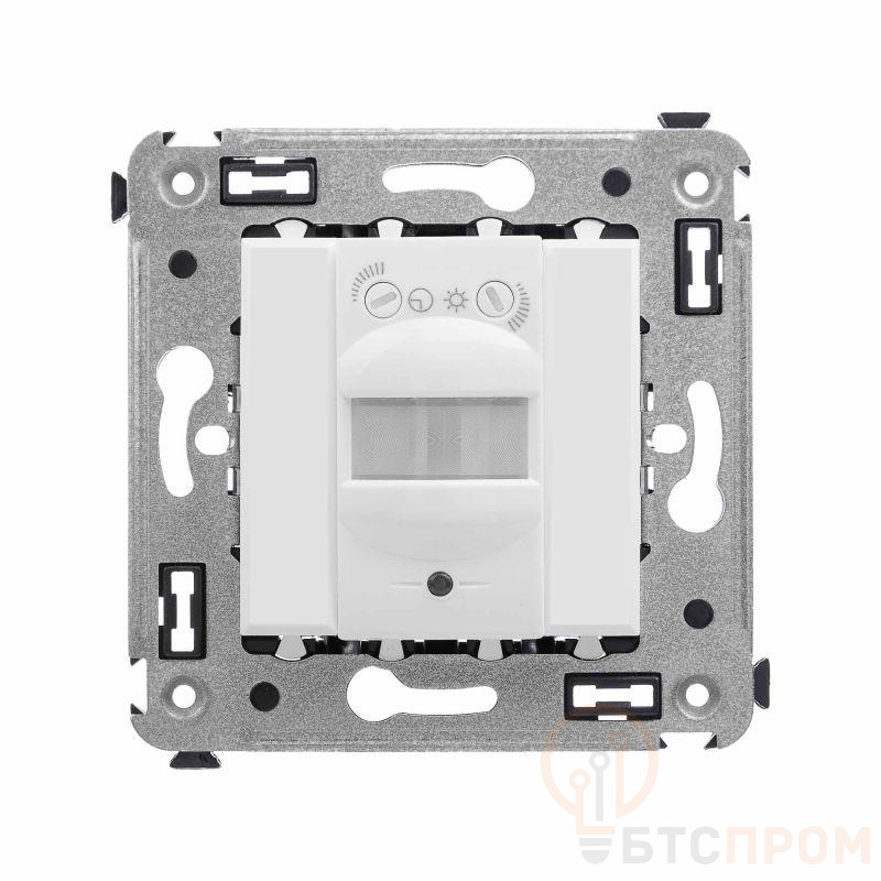 Датчик движения. Назначение: для монтажа в подрозеточные коробки глубиной не менее 45 мм (код 59301). Используется для автоматического включения/выключения света. Характеристики: диаметр отверстий для ввода кабелей – 3 мм; винтовые зажимы; шаблон для зачистки кабеля – 11 мм; расстояние обнаружения – от 2 до 12 м; угол охвата – 150°; время задержки отключения – от 10 с до 7 мин.; настройка светочувствительности датчика; настройка порога освещенности; фиксация в подрозеточные коробки глубиной не менее 45 мм при помощи каркаса с лапками (код 4400802) и саморезов. Цвет: "Белое облако". Производитель оставляет за собой право вносить во внешний вид изделия изменения, которые не влияют на его функционал, безопасность и надежность.