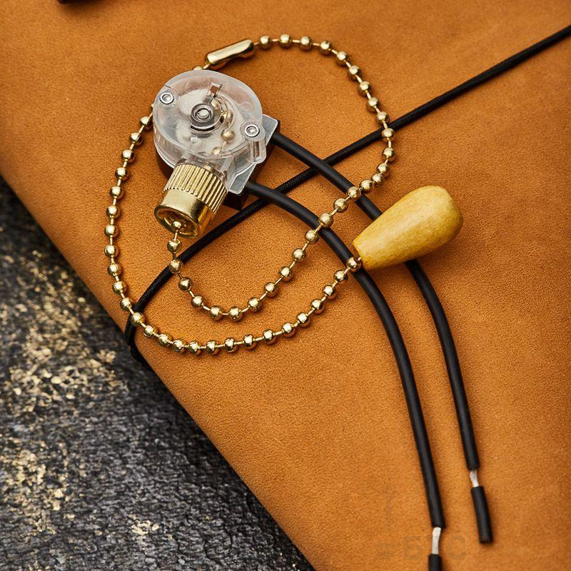 Выключатель для настенного светильника с хромированной цепочкой, проводами и деревянным наконечником. Длина цепочки: 270 мм Цвет цепочки: золото Напряжение: 220 В Длина провода: 120 мм