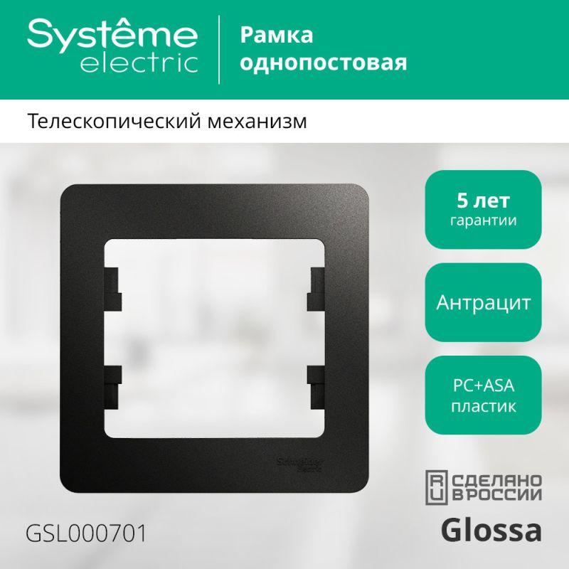 Рамка Systeme Electric (ранее Schneider Electric) серии Glossa (цвет антрацит) одинарная. - Выполнена из материала PС+ASA, стойкого к УФ-излучению и появлению царапин. - Позволяет гармонично вписать электроустановочное изделие в интерьер помещения.