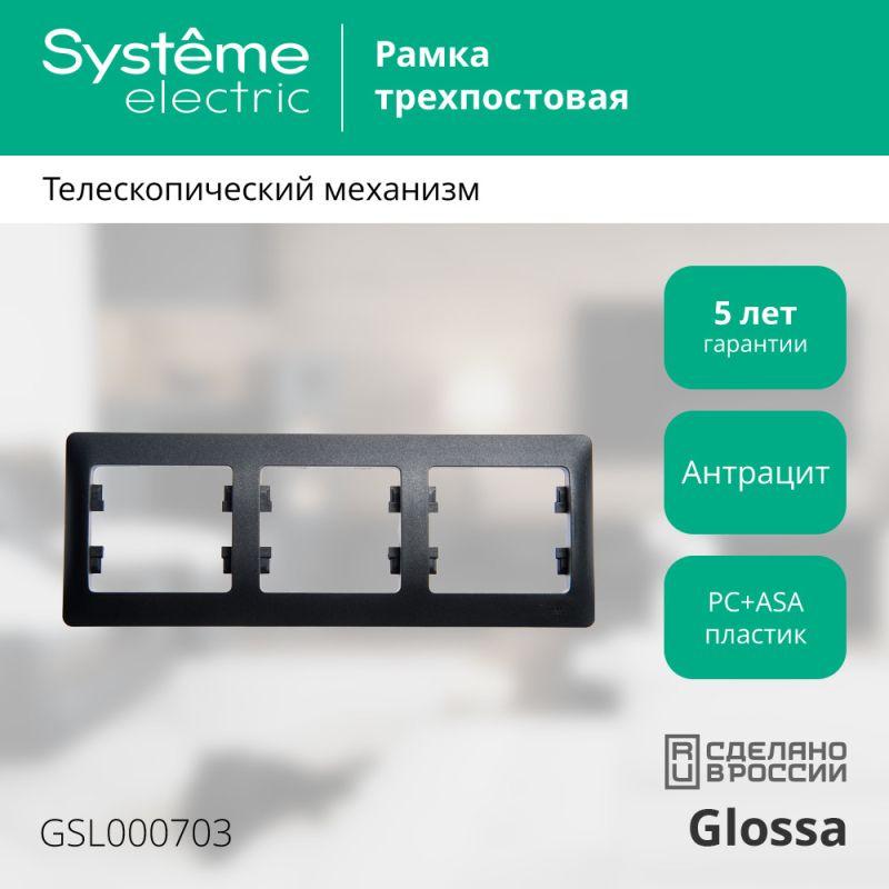 Рамка Systeme Electric (ранее Schneider Electric) серии Glossa (цвет антрацит) трёхместная. - Устанавливается в горизонтальном положении. - Выполнена из материала PС+ASA, стойкого к УФ-излучению и появлению царапин. - Позволяет гармонично вписать электроустановочное изделие в интерьер помещения.