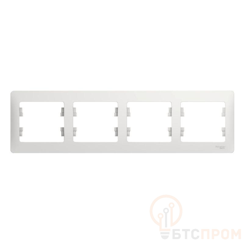 Рамка Systeme Electric (ранее Schneider Electric) серии Glossa (цвет белый) четырёхместная. - Устанавливается в горизонтальном положении. - Выполнена из материала PС+ASA, стойкого к УФ-излучению и появлению царапин. - Позволяет гармонично вписать электроустановочное изделие в интерьер помещения.
