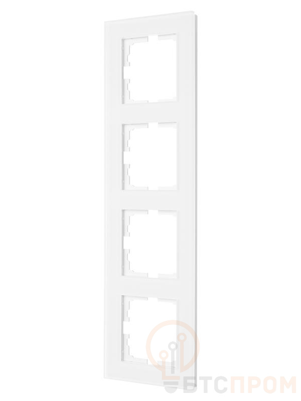 Основа конструкции — прочное матовое стекло, устойчивое к механическим воздействиям и выцветанию. Рамка предназначена для установки четырех вертикальных модульных устройств (например, розеток или выключателей) стандартного размера. Точная геометрия и качественные материалы обеспечивают простой монтаж и надежную фиксацию электроустановочных изделий.
