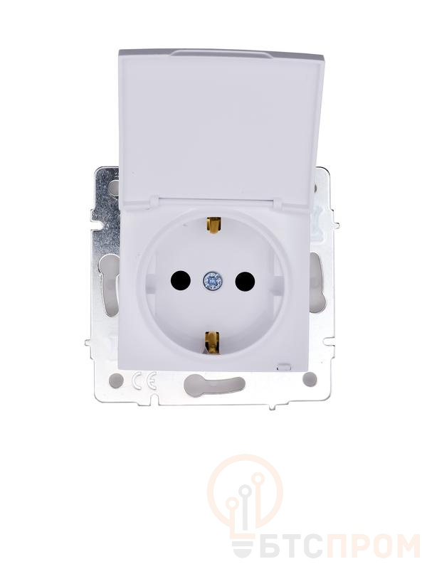 Механизм выполнен из прочного белого ПБТ-пластика, рассчитан на номинальный ток 16А и напряжение до 250В. Установочная часть (суппорт) изготовлена из оцинкованной стали, что обеспечивает долговечность и устойчивость к коррозии. В комплекте поставляется пластиковая накладка-рамка.