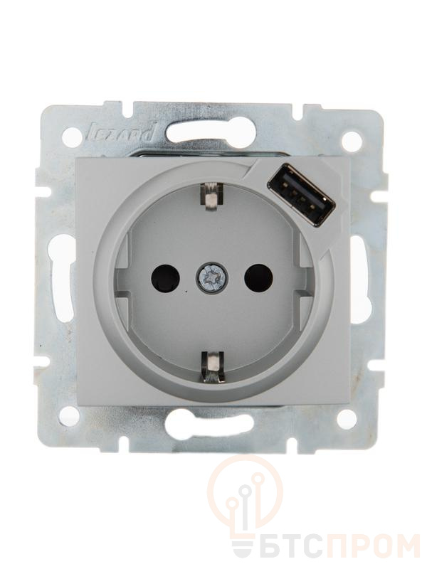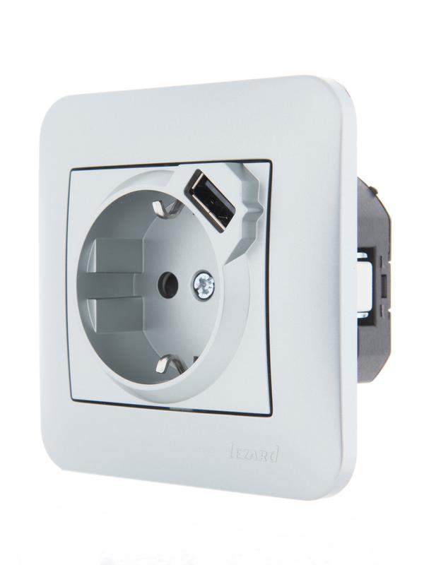 Розетка 1-м СП Karina 16А с заземл. с заряд. устройством USB механизм матов. серебр. LEZARD 707-4388-181