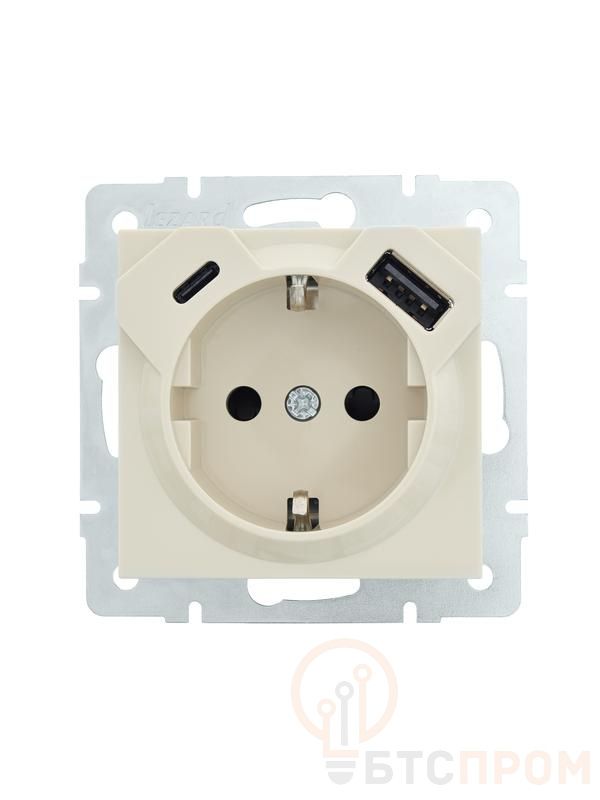 Розетка 1-м СП Vesna с заземл. с заряд. устройством USB + тип C механизм крем. LEZARD 742-0388-181TC