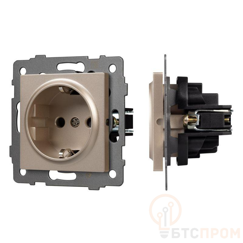 Механизм розетки с заземлением на 1 пост. Цвет - золотой. Без фронтальной рамки. Уровень пылевлагозащиты IP20. Устанавливается в стандартный подрозетник. Габаритные размеры: длина 71 мм, ширина 71 мм, высота 44 мм. Гарантийный срок 10 лет.