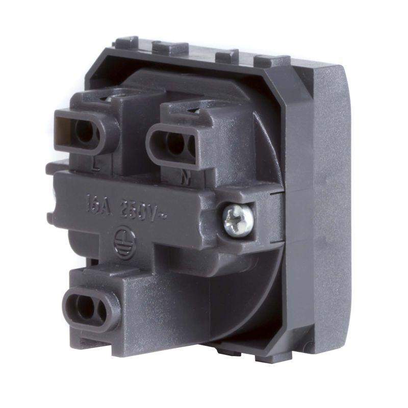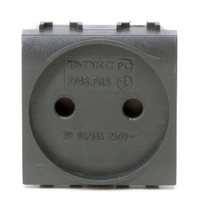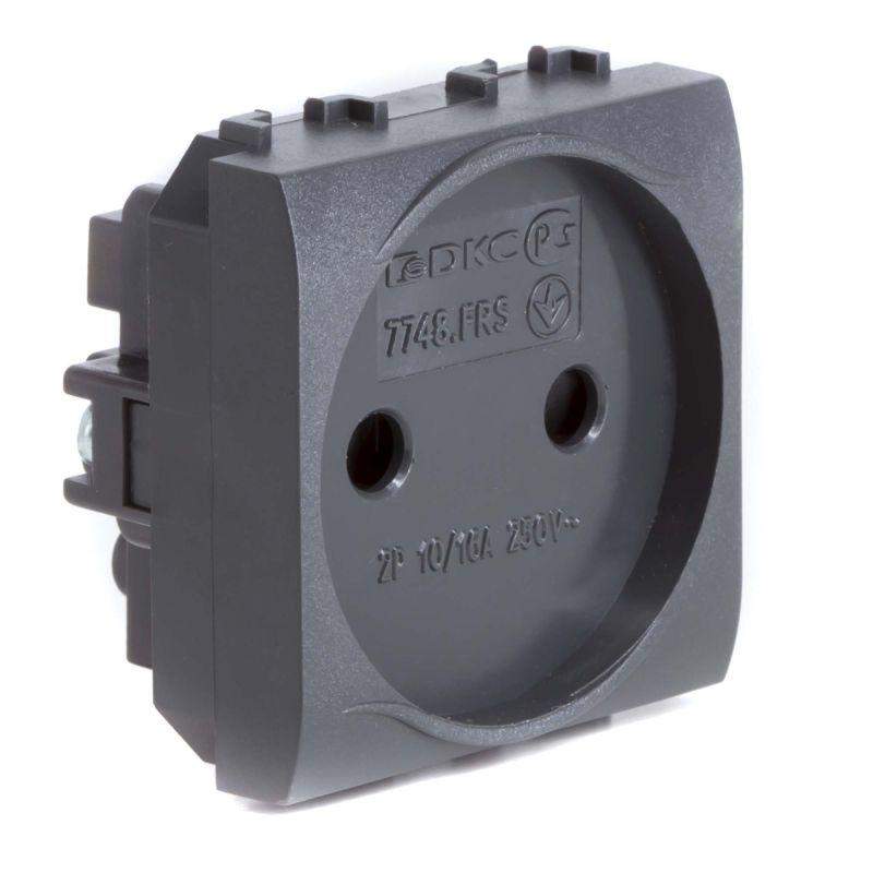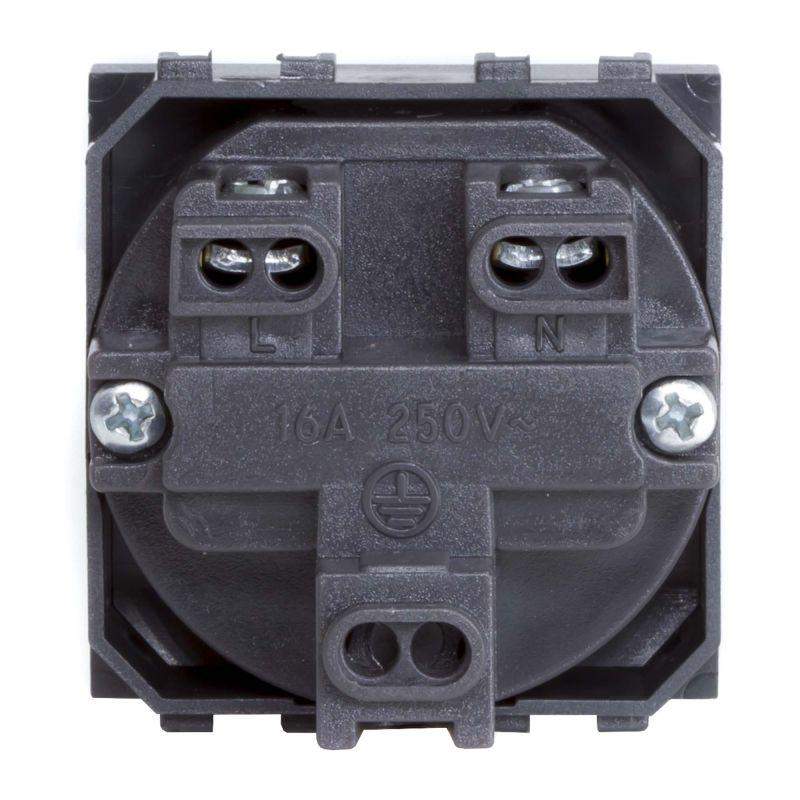 Силовая электрическая розетка штекерная без заземления со шторками. Назначение: подключение оргтехники, бытовых приборов и т. п. Характеристики: в соответствии с ПУЭ, пункт 7.1.49 - имеются защитные шторки, автоматически закрывающие гнезда штепсельной розетки при вынутой вилке; имеется заземление; диаметр отверстий для ввода кабелей - 3 мм (по 2 отверстия на клемму); номинальный ток - 16 А; номинальное напряжение - 250 B. Кол-во модулей: 2. Цвет: черный