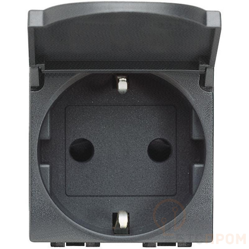 Устройство рассчитано на номинальный ток 16А и напряжение до 250В, что позволяет подключать большинство бытовых приборов. Конструкция предусматривает два полюса и заземляющий контакт (2P+E) для обеспечения повышенной электробезопасности. Степень защиты IP20 указывает на то, что розетка предназначена для использования внутри сухих помещений и защищена от проникновения твердых предметов размером более 12.5 мм.