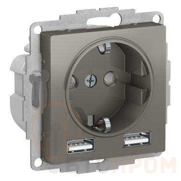 Розетка 1-м СП AtlasDesign 16А IP20 с 2-мя заряд. устройствами USB тип A+A 5В/2.4А 2х5В/1.2А механизм сталь SE ATN000930