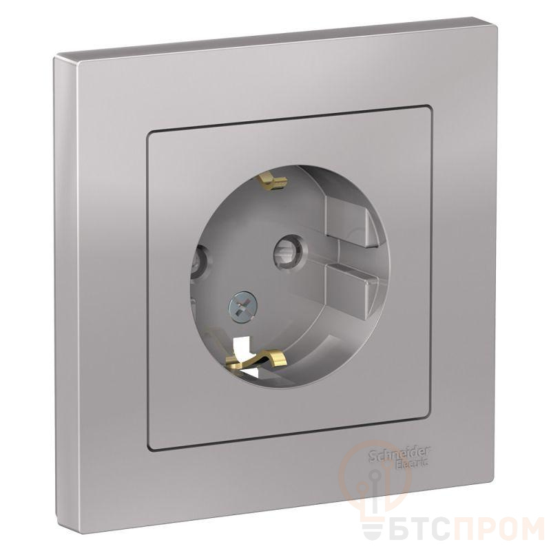 Розетка Systeme Electric (ранее Schneider Electric) серии AtlasDesign (в сборе, цвет алюминий) одинарная с заземлением и со шторками подходит для сетей 250 В, на ток 16 А. - Заземляющий контакт обеспечивает дополнительную защиту от удара электрическим током. При наличии заземления электрический потенциал уходит в землю, защищая человека. - Лицевые детали из качественного ABS-пластика, устойчивого к царапинам и УФ-излучению. - Изделие поставляется в комплекте с рамкой того же цвета.