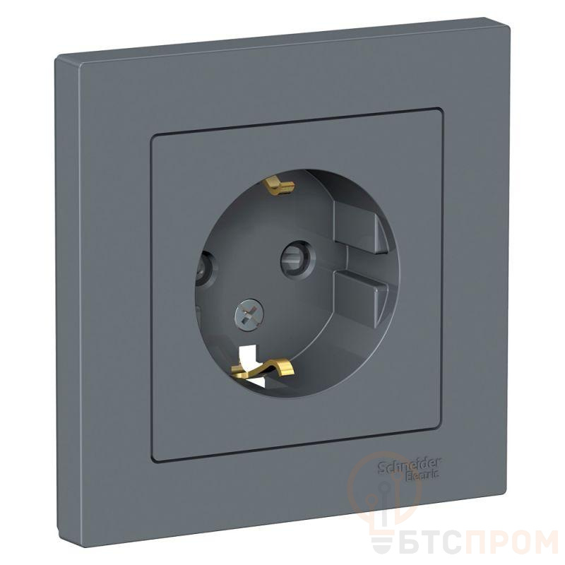 Розетка Systeme Electric (ранее Schneider Electric) серии AtlasDesign (в сборе, цвет грифель) одинарная с заземлением и без шторок подходит для сетей 250 В, на ток 16 А. - Заземляющий контакт обеспечивает дополнительную защиту от удара электрическим током. При наличии заземления электрический потенциал уходит в землю, защищая человека. - Лицевые детали из качественного ABS-пластика, устойчивого к царапинам и УФ-излучению. - Изделие поставляется в комплекте с рамкой того же цвета.