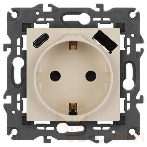 Розетка 1-м СП Elegance 14-4108-02 16А 250В 2P+E с USB type-A+C 5В-3А защ. шторки сл. кость Эра Б0067725