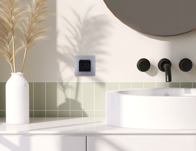 Розетка с заземлением, защитной крышкой и интегрированными защитными шторками ETIKA для скрытого монтажа, степень пылевлагозащиты IP44. Применяется для электропитания в зданиях с проводкой с заземлением (с защитным проводником). Предназначена для установки в местах с повышенной влажностью. Оснащена интегрированными шторками, которые защищают детей и других пользователей от удара электрическим током.