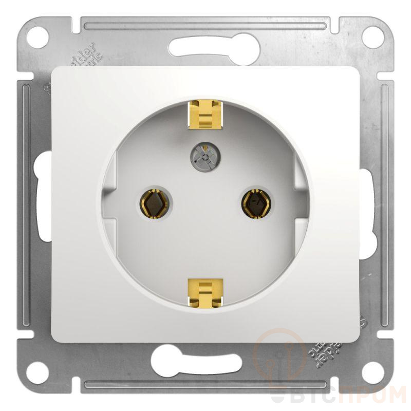 Механизм Systeme Electric (ранее Schneider Electric) серии Glossa (цвет белый) розетки одинарной с заземлением и без шторок подходит для сетей 250 В, на ток 16 А. - Заземляющий контакт обеспечивает дополнительную защиту от удара электрическим током. При наличии заземления электрический потенциал уходит в землю, защищая человека. - Выполнен из материала PС+ASA, стойкого к УФ-излучению и появлению царапин. - Эргономичные клеммы розеток расположены в один ряд.
